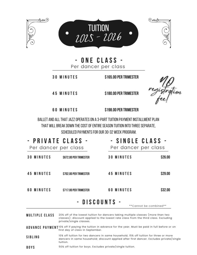 Ballet and All That Jazz operates on a 3-part tuition payment installment plan that will break down the cost of entire Season tuition into three separate, scheduled payments for our 30-32 week program. There are no discounts for 3 week months and no additional charge for 5 week months. Our dance program offers extra classes during the season in the event we must cancel our classes due to unexpected cancellations. Should the total number of class go below the specified weeks, we will offer a make-up class accordingly.